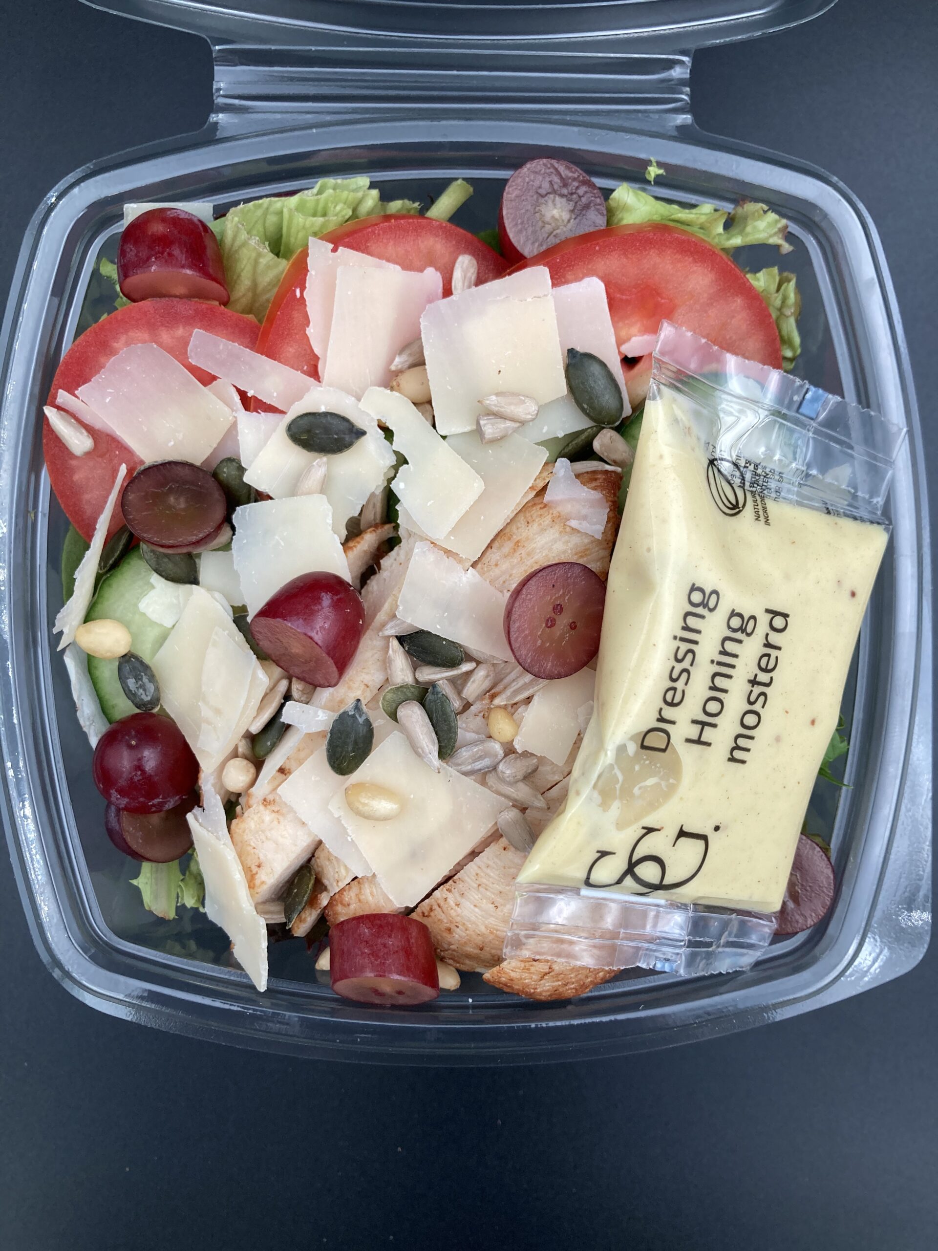 Sla, kipfilet, komkommer, tomaat, ei, druiven, pittenmix, honing-mosterd dressing